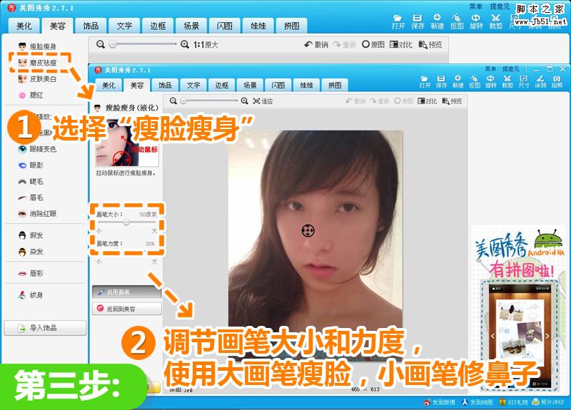 3、然后調(diào)整臉部輪廓。點(diǎn)擊“瘦臉瘦身”,將畫筆調(diào)整到適合的大小(畫筆力度大處理對(duì)象不容易模糊),沿著臉的輪廓向內(nèi)拉伸來瘦臉;縮小畫筆處理鼻子,輕輕松松變成小臉。