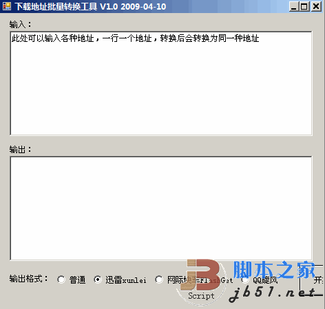 在“輸入”里可以輸入任何地址如:迅雷xunlei,網(wǎng)際快車FlashGet,QQ旋風(fēng),普通下載地址 都可以(格式是 一行一個下載地址),然后選擇“輸出格式”后,點“開始轉(zhuǎn)換”,便可以將輸入的各類地址轉(zhuǎn)換為最終您想要的地址。