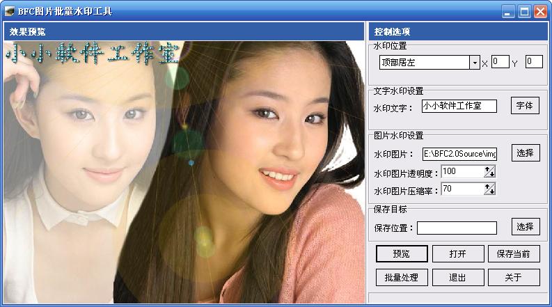 本程序功能將作為一個功能模塊集成到最新版本的BFC采集器附件上傳程序中。所不同的是,BFC采集器附件上傳程序中的圖片水印添加功能只在內(nèi)存中對圖片進(jìn)行處理并將處理后的圖片上傳,并不會對原始圖片文件進(jìn)行修改。