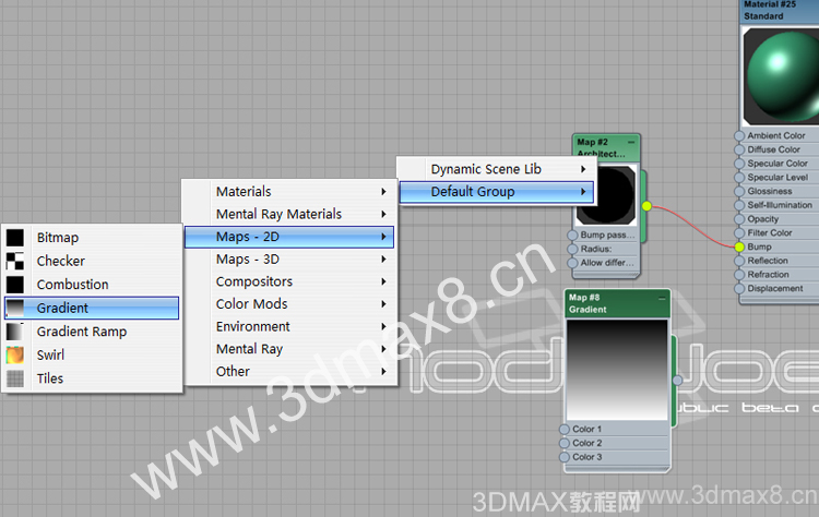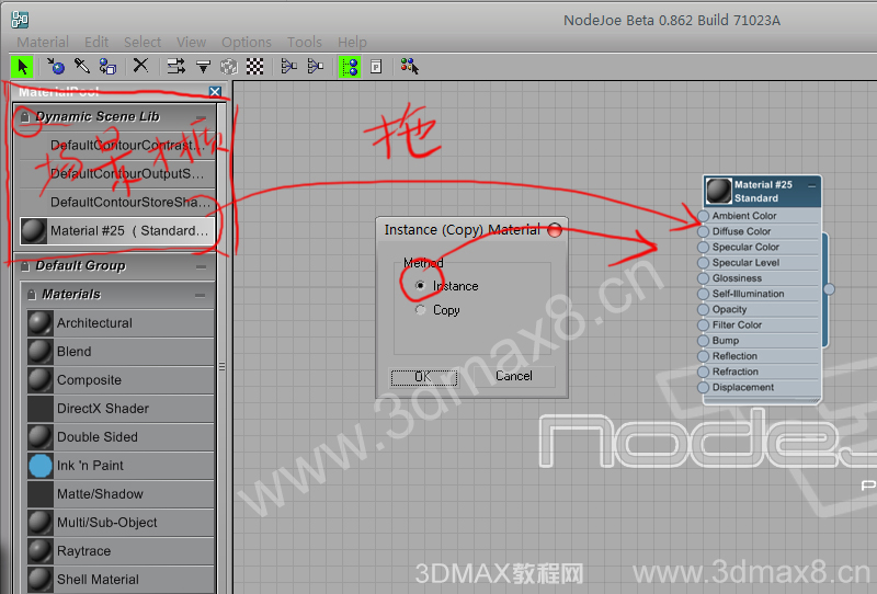 好,這時候場景中box就被賦予了一個標準材質,而且在節(jié)點編輯視圖的 場景 動態(tài)更新組里也就出現(xiàn)場景中box標準材質了,把他拖到視圖,用關聯(lián).如圖