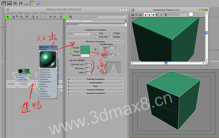 將這個節(jié)點連接給標準材質的 bump 并且雙擊標準材質,進入到屬性編輯,給他一定高光和合適顏色.渲染.