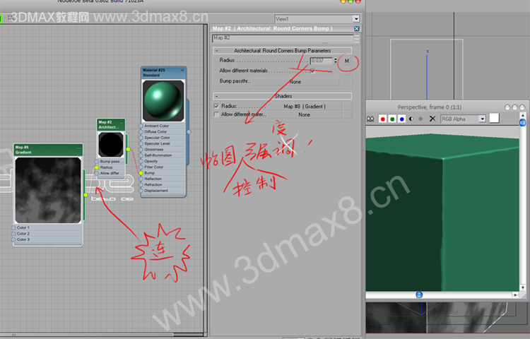 連接給,round節(jié)點的強度. 如圖.渲染.發(fā)現(xiàn),box的倒角變得不規(guī)則. 越黑的地方越弱.