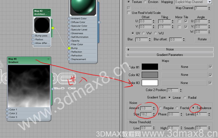 將這個節(jié)點連接給標準材質的 bump 并且雙擊標準材質,進入到屬性編輯,給他一定高光和合適顏色.渲染.3DMAX教程>渲染教程> www.dhdzp.com/html/xrjc/index.html