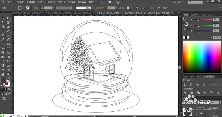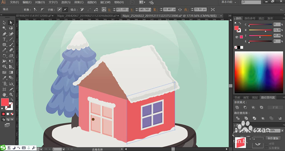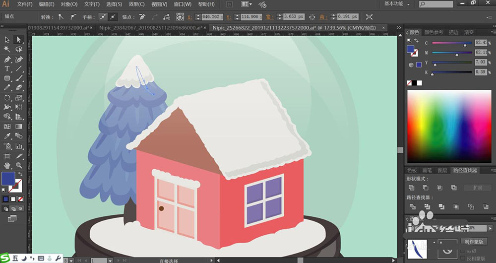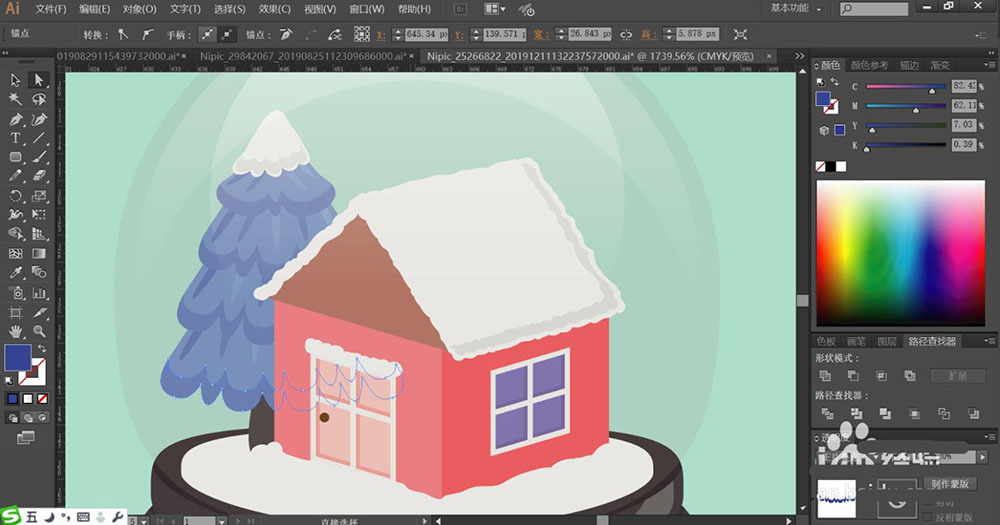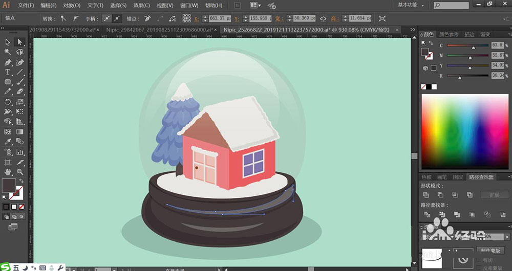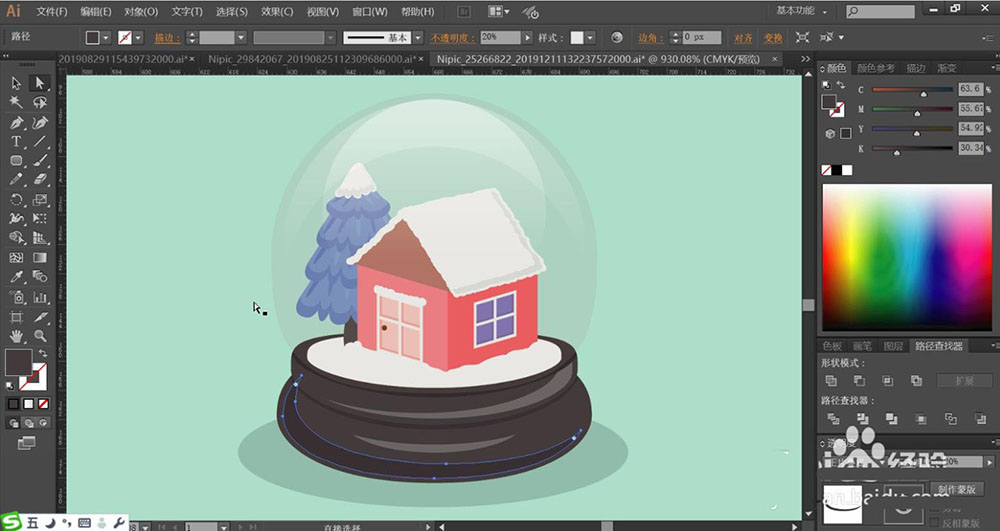 1、使用圓形工具畫(huà)出八音盒的外壁,再畫(huà)出八音盒的圓形基座包括基座上面的明暗光線的路徑,接著,我們使用鋼筆畫(huà)出八音盒里面的小房子與松樹(shù)的細(xì)節(jié)路徑,重點(diǎn)畫(huà)出窗戶以及邊緣的暗光效果。