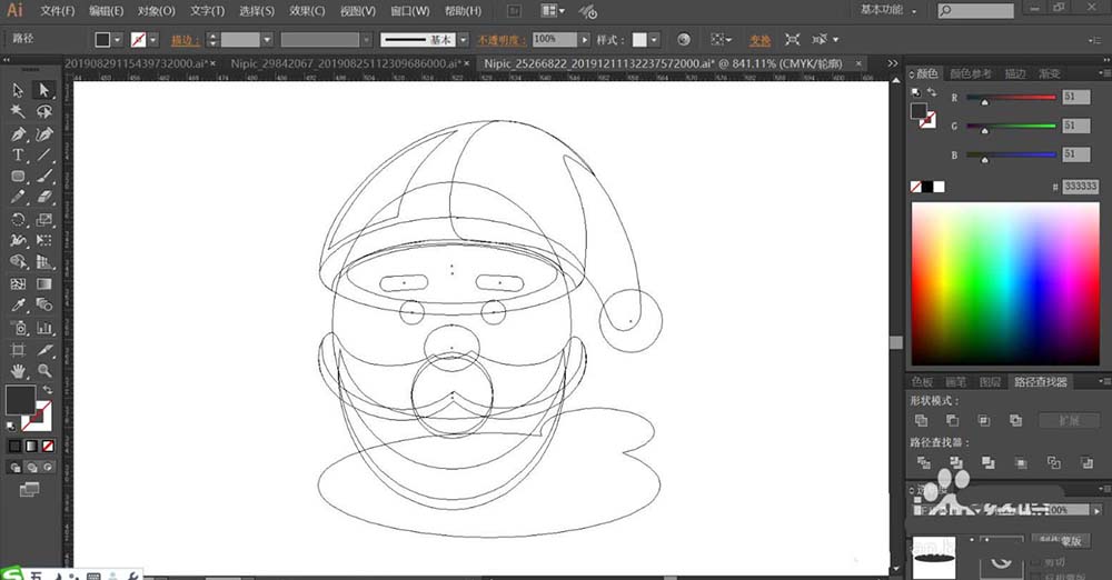 4、接著,我們用鋼筆畫出圣誕老人頭像的基本輪廓,再畫出他的表情與周邊元素的路徑,重點(diǎn)繪制出帽子、胡子、陰影等路徑。