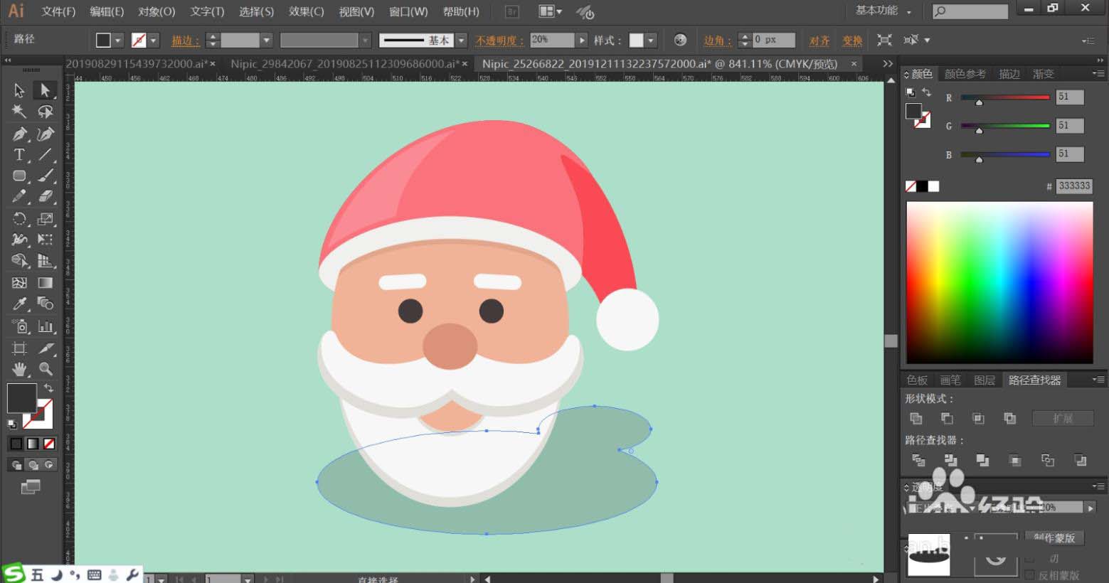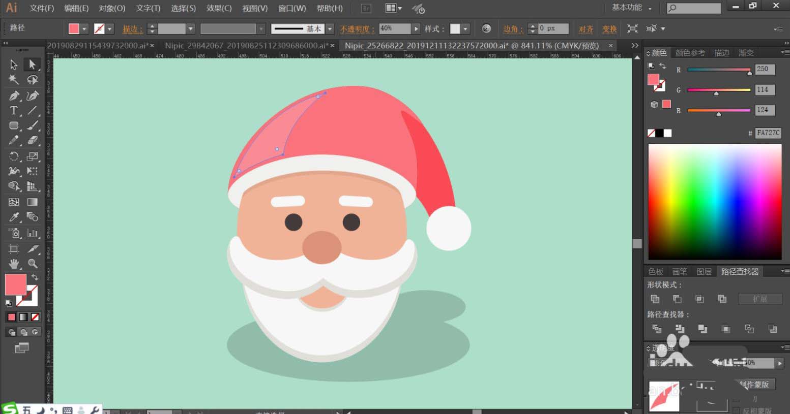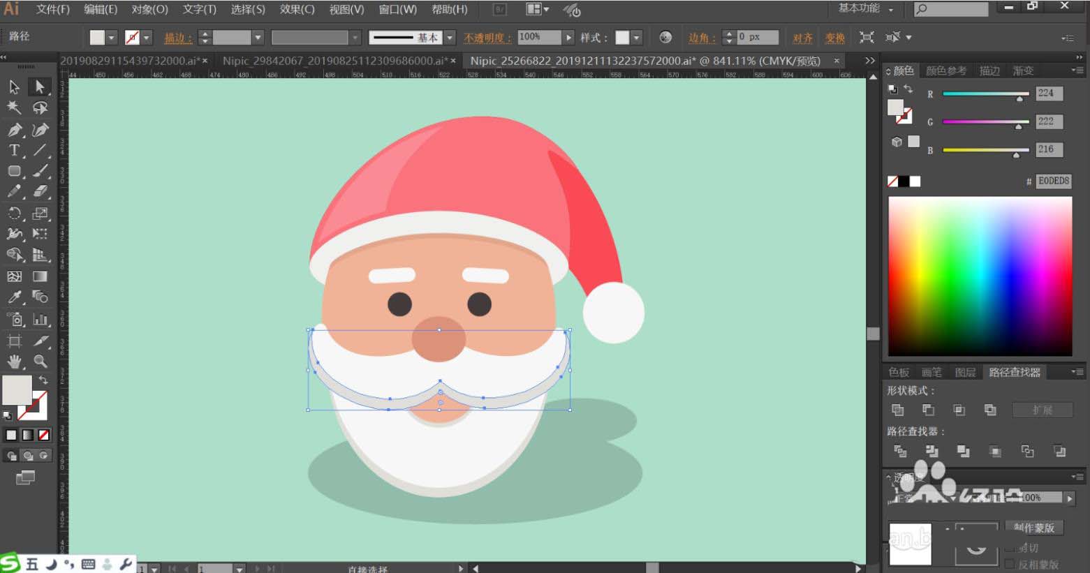 7、最后,我們用灰白色填充胡子與嘴巴的暗光路徑,再用半透明的灰黑色填充圣誕老人的頭像的陰影,設(shè)置陰影為正片疊底模式,完成圣誕老人頭像設(shè)計(jì)。