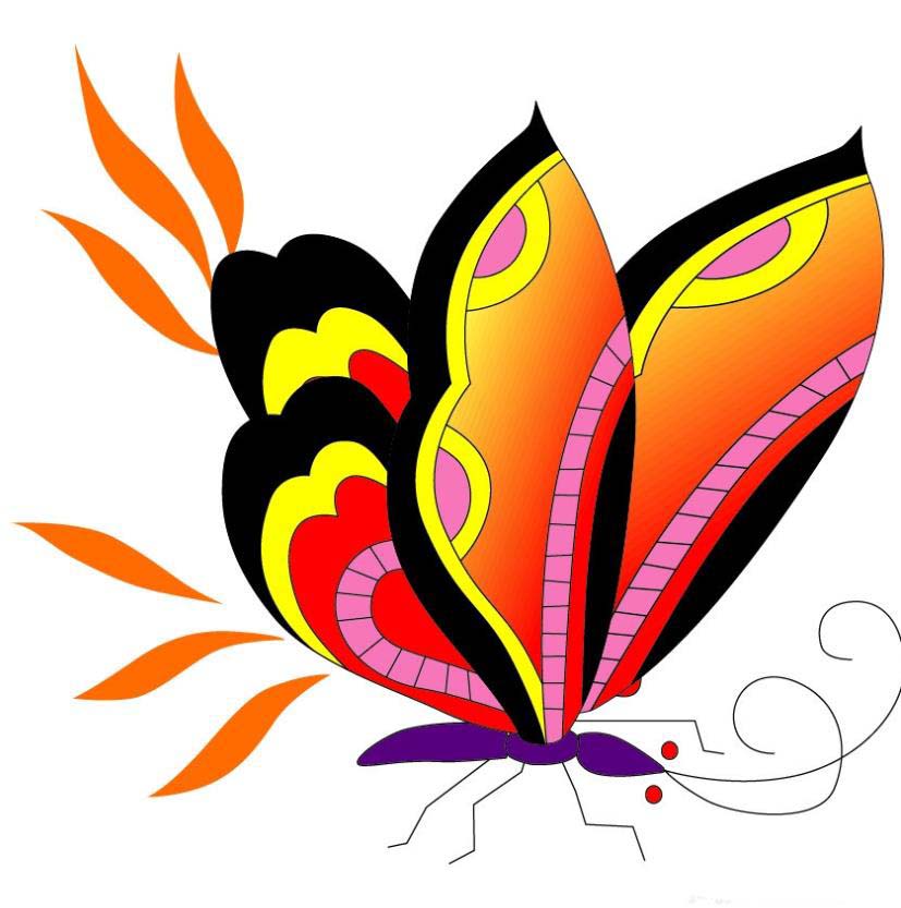 2、彩鳳蝶的翅膀用黑色與黃色搭配填充邊緣,再用橙紅色的漸變填充翅膀的主體。