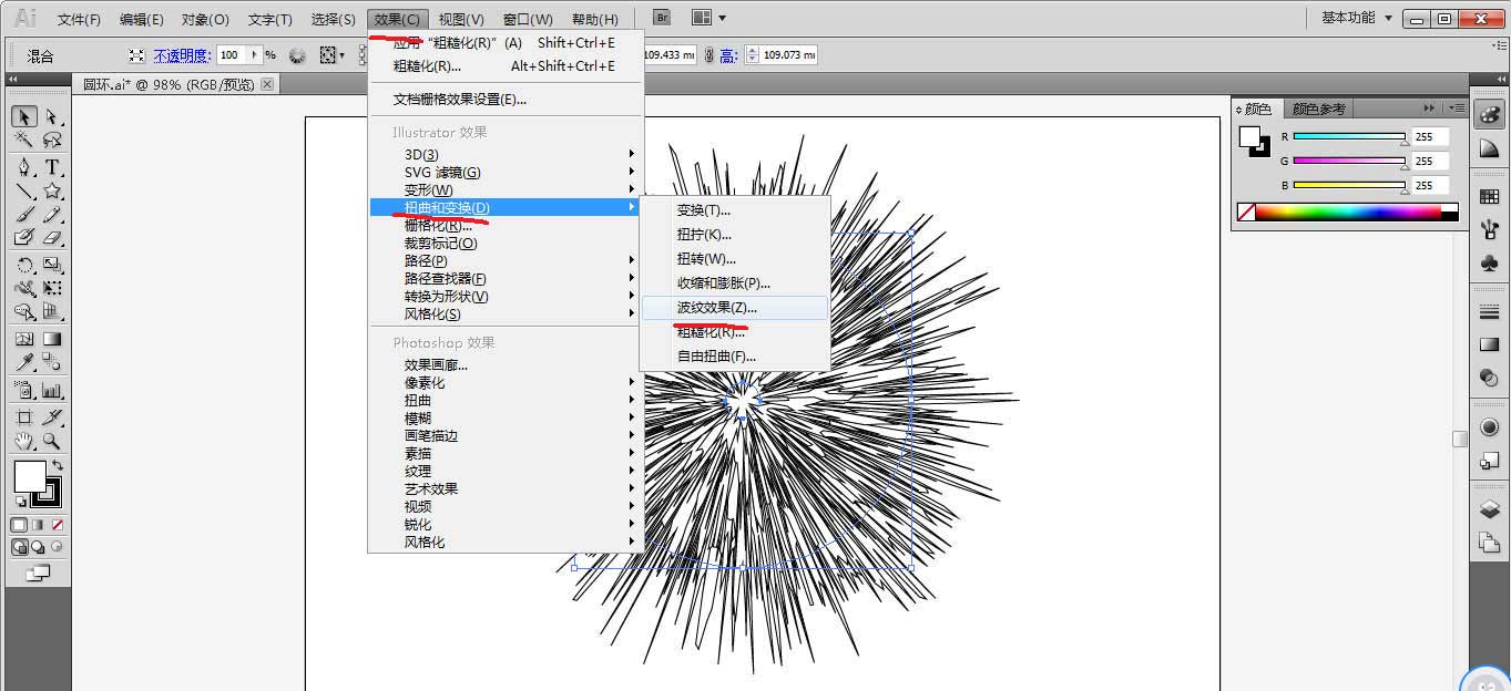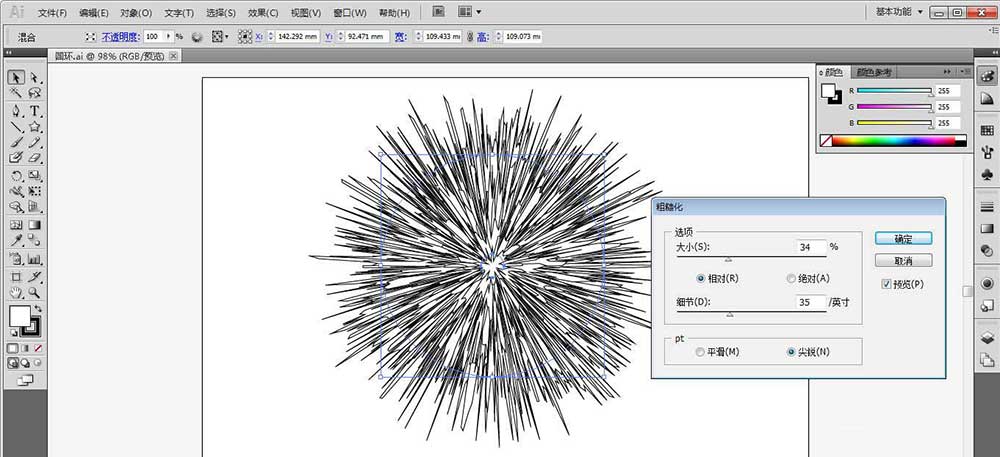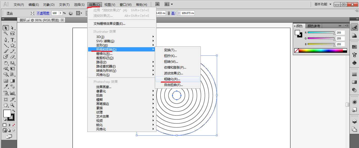 4、選擇圓環(huán),點(diǎn)擊效果-扭曲和變換-粗超化,預(yù)覽設(shè)置效果