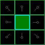 在這一點(diǎn),你應(yīng)該形成如圖的結(jié)構(gòu)。在圖中,暗綠色方格是你起始方格的中心。它被用淺藍(lán)色描邊,以表示它被加入到關(guān)閉列表中了。所有的相鄰格現(xiàn)在都在開(kāi)啟列表中,它們被用淺綠色描邊。每個(gè)方格都有一個(gè)灰色指針?lè)粗杆麄兊母阜礁?,也就是開(kāi)始的方格。