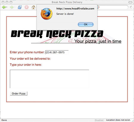 它僅僅發(fā)出一些簡單的警告,告訴您服務器什么時候完成了任務。在自己的網(wǎng)頁中試驗這些代碼,然后在瀏覽器中打開(如果希望查看該例中的 XHTML,請參閱 清單 8)。輸入電話號碼然后離開該字段,將看到一個彈出的警告窗口(如 圖 3 所示),但是點擊 OK 又出現(xiàn)了……