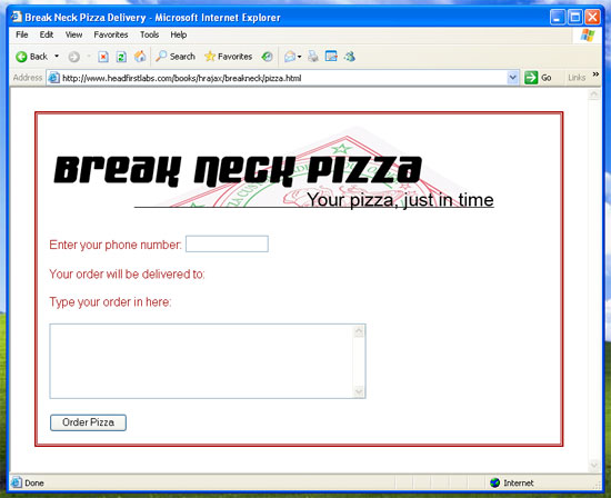 Ajax 采用一種沙箱安全模型。因此,Ajax 代碼(具體來說就是 XMLHttpRequest 對象)只能對所在的同一個域發(fā)送請求。以后的文章中將進一步介紹安全和 Ajax,現(xiàn)在只要知道在本地機器上運行的代碼只能對本地機器上的服務器端腳本發(fā)送請求。如果讓 Ajax 代碼在 www.breakneckpizza.com 上運行,則必須 www.breakneck.com 中運行的腳本發(fā)送請求。