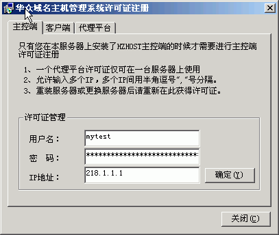 請(qǐng)?zhí)顚懺S可證用戶名和密碼以及服務(wù)器的公網(wǎng)IP地址,點(diǎn)擊"確定"進(jìn)行注冊(cè)。