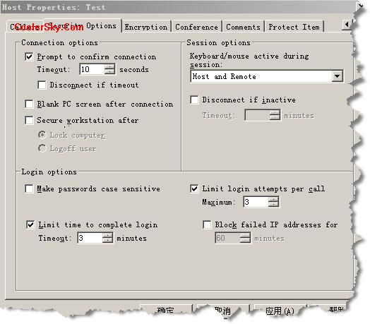 “Login options”可以限制對(duì)本機(jī)進(jìn)行登錄的次數(shù)與時(shí)間,默認(rèn)值是每 個(gè)人只允許登錄三次,每一次登錄所用的時(shí)間是3分鐘;