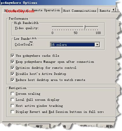“ColorScale”可以選擇主控端顯示的顏色級(jí)別,在列表框中可以 選擇一種適合網(wǎng)絡(luò)連接速度的顏色級(jí)別,或者干脆采用犧牲顏色級(jí)別換取連接速率的方案。