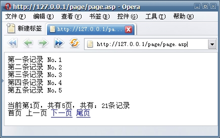 rs.pagesize=5,這個(gè)什么意思呢?它就是在Recordset對(duì)象中的一個(gè)內(nèi)置屬性,它的作用是指定每頁(yè)的記錄條數(shù),設(shè)置為5時(shí),每5條記錄放在一起成一頁(yè),比如實(shí)例中共有21條記錄,那么,使用rs.pagesize分頁(yè)后,這21條記錄將分成5頁(yè)進(jìn)行顯示。
