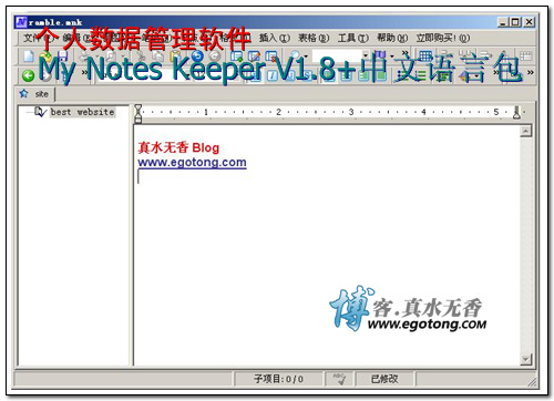 My Notes Keeper 是一款功能強大、簡單易用的樹狀標簽結構個人數(shù)據(jù)庫管理軟件,能進行個人信息管理和文字、表格處理,有密碼保護功能。你可以通過它管理你的通訊簿、網(wǎng)址收藏和安排日程表等,甚至可以用它來制作電子書。軟件的操作方式跟 Word 幾乎沒有多大區(qū)別,對中文的支持也非常好!推薦使用!