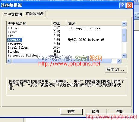 4。選取[機(jī)器數(shù)據(jù)源]標(biāo)簽,選擇我們之前設(shè)置的dwmxphp然后[確定]
