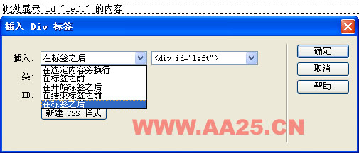當(dāng)插入一個(gè)div后,接著插入第二個(gè)時(shí),在插入div標(biāo)簽的插入會(huì)多出一個(gè)選項(xiàng):在選定內(nèi)容旁換行,這樣插入就把這個(gè)div標(biāo)簽插入到了id為left的div之內(nèi),這并不是本例所要的結(jié)果,所以我們選擇在標(biāo)簽之后,然后在右側(cè)激活的下拉列表中找到<div id="#left">,這樣我們插入的id為right的div就插入到了left的后邊。如下圖所示:
