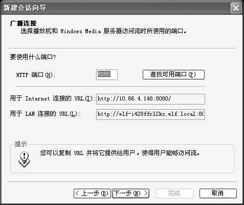 3. 下一步的“廣播方法”窗口中選擇“自編碼器拉傳遞”方式,在接下來的“廣播連接”窗口中可以確定電視廣播所使用的端口,默認(rèn)端口為8080,同時(shí)列出了訪問服務(wù)器的Internet(http://10.66..4.148:8080/)以及局域網(wǎng)地址(http://wlf-i428ffrl2kz.wlf.local:8080/)(如圖)。