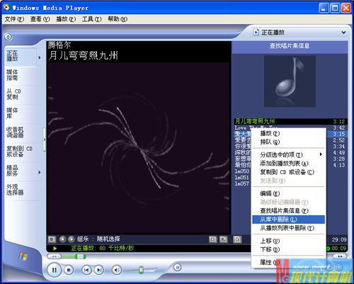 在WMP9/10播放器的播放列表中右鍵點擊不需要的媒體文件,從彈出的右鍵菜單中選擇“從庫中刪除”(圖3),然后再在彈出的刪除確認對話框中選擇其中的“從媒體庫和計算機中刪除”,最后單擊“確定”按鈕即可將其送入回收站。