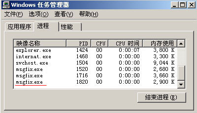 這幾天我上因特網(wǎng)速度突然很慢,同時(shí)在操作電腦的時(shí)候也發(fā)現(xiàn)系統(tǒng)速度很慢,但是我裝的殺毒軟件對(duì)于此病毒沒(méi)有任何報(bào)警。檢查計(jì)算機(jī)發(fā)現(xiàn)在系統(tǒng)進(jìn)程表中有三四個(gè)msgfix.exe文件,而有時(shí)候甚至多達(dá)六七個(gè)msgfix.exe文件(見(jiàn)圖),CPU占用率經(jīng)常高達(dá)80%以上。
