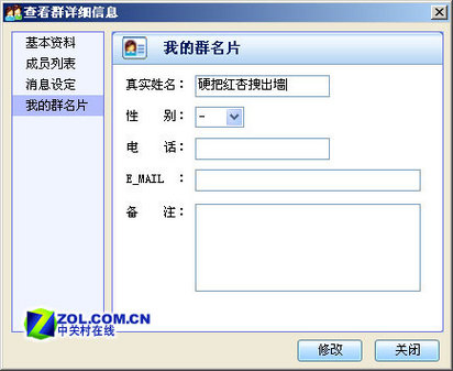 所謂“群名片”就是你在群里的名字。一個(gè)煽情的名字很能吸引MM的眼球噢!在QQ群的聊天窗口上點(diǎn)擊“群設(shè)置”→“修改自己的群名片”(如圖3),然后彈出的窗口中的“真實(shí)姓名”一欄中輸入一個(gè)你中意的名字(如圖4),最后單擊“修改”按鈕,等到系統(tǒng)彈出修改成功的提示窗口就可以了。嘿嘿,看看我的群名片是不是很……