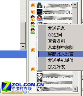 這個(gè)時(shí)候你只要在QQ聊天窗口右側(cè)的“參與欄”中右鍵點(diǎn)擊他的QQ頭像,在彈出的菜單里選擇“屏蔽此人發(fā)言”就行了(如圖5)。