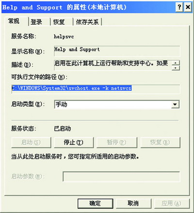 下面我們以svchost啟動(dòng)helpsvc(Help and Support)服務(wù)為例,介紹其啟動(dòng)服務(wù)的方法。在Windows XP中點(diǎn)擊“開(kāi)始” “運(yùn)行”,輸入“services.msc”命令,彈出服務(wù)對(duì)話框,然后雙擊打開(kāi)“Help and Support”服務(wù)屬性對(duì)話框,可以看到helpsvc服務(wù)的可執(zhí)行文件的路徑為“C:\WINDOWS\System32\svchost.exe -k netsvcs” (如圖2),說(shuō)明helpsvc服務(wù)是依靠SVCHOST調(diào)用“netsvcs”參數(shù)來(lái)實(shí)現(xiàn)的,而參數(shù)的內(nèi)容則是存放在系統(tǒng)注冊(cè)表中的。