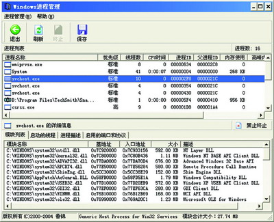 如果你想了解每個(gè)SVCHOST進(jìn)程當(dāng)前到底提供了哪些系統(tǒng)服務(wù),可以在命令提示符下輸入命令來(lái)查看。例如在Windows XP中,打開(kāi)“命令提示符”,鍵入tasklist /svc命令查看;在Windows 2000中,則輸入“Tlist -S”命令來(lái)查看?! ?