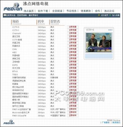 不過,在軟件的主頁上,還另外提供了17個頻道,用戶在網(wǎng)頁中直接點擊“立即觀看”按鈕也可以啟動軟件的播放程序,有興趣的朋友可以去看看(如圖12)。