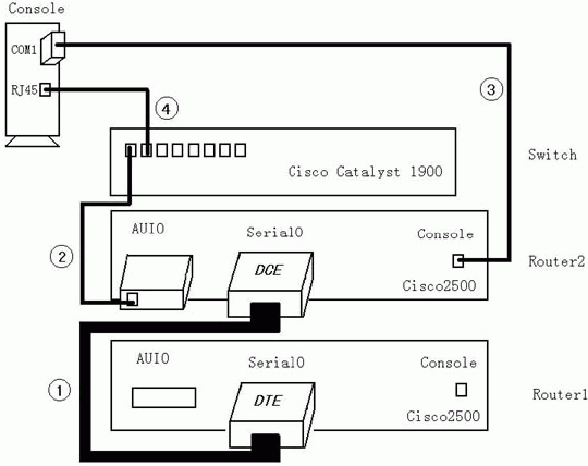 2、背對背線纜一條(一端標(biāo)明為DTE,一端標(biāo)明為DCE,用于直接連接兩臺路由器的串口),AUI轉(zhuǎn)RJ45線纜一條(用于連接Cisco 2500路由器的以太網(wǎng)口和Cisco Catalyst 1900交換機(jī)端口),RJ45轉(zhuǎn)COM口配置線一條(用于連接Cisco 2500路由器的Console口和管理工作站的COM1口),RJ45直連線一條(用于連接管理工作站的網(wǎng)卡口和Cisco Catalyst 1900交換機(jī)端口)。