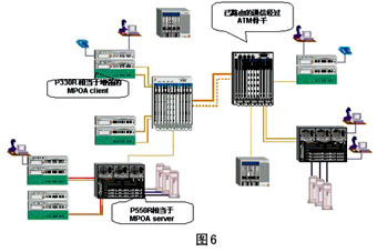 ----在該方案中,使用了朗訊科技A770作為ATM的骨干網(wǎng)絡(luò)(如圖6所示),提供622Mbps、155Mbps交換端口,P550和P330都可以提供ATM 的上連,并在邊緣支持路由。