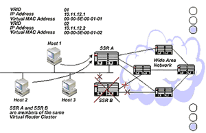 SSR在集群里使用VRRP信息去選擇主路由,其它SSR成為熱備份路由器。集群里的每一個(gè)路由器提供一個(gè)虛擬的MAC地址(而不是它實(shí)際的MAC地址)作為對(duì)主機(jī)應(yīng)答的ARP(地址解析協(xié)議)原地址,且每個(gè)路由器也發(fā)送由ICMP(網(wǎng)間控制報(bào)文協(xié)議)重定向優(yōu)化了的IP主機(jī)作業(yè)。如果集群中的任何路由器或它們的局域網(wǎng)連接失敗,則主路由器接管其相應(yīng)作業(yè),并通過(guò)取代它的虛擬MAC地址和IP地址實(shí)現(xiàn)ARP應(yīng)答。如果主路由器失敗,剩下的路由器會(huì)選擇一個(gè)新的主路由器,它取代了失敗的主路由器的虛擬MAC地址和虛擬IP地址。