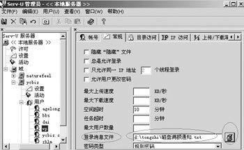 如何有效利用磁盤空間,也是校園網資源庫維護過程中常碰到的問題。有不少老師在使用自己的磁盤空間時沒有計劃,一旦分給他們的磁盤空間存滿了,就以為系統(tǒng)出了問題。怎樣適時地提醒他們呢?這里,可采用Serv-U另一功能:給登錄用戶發(fā)信息文件。當某位老師的磁盤空間要滿的時候,我們可以發(fā)一個提示文件告訴他。這樣,他就會對自己的磁盤空間進行整理。