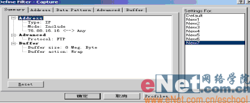 2、定義過濾器。在FTP客戶端上運(yùn)行Sniffer軟件,進(jìn)入系統(tǒng),點(diǎn)“Monitor”-“Matrixa”,選中本機(jī),點(diǎn)鼠標(biāo)右健,選擇“Define Filter…”,在“Define Filter…”窗口,點(diǎn)“Advanced”,選擇IP->TCP->FTP,點(diǎn)“確定”,即已定義好過濾器,如圖1所示。