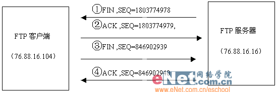 至此,F(xiàn)TP客戶端與FTP服務(wù)器之間的一個TCP連接就結(jié)束了。TCP連接結(jié)束的四次過程示意圖如圖5所示。