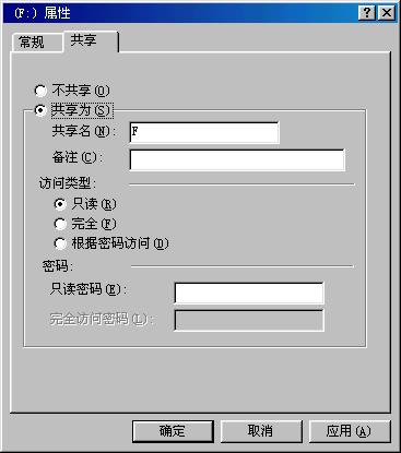 打開(kāi)“我的電腦”,將你需要設(shè)為共享的盤符或文件夾選項(xiàng)設(shè)為共享,方法是,選定該盤符或文件夾,然后單點(diǎn)鼠標(biāo)右鍵,選“屬性”中的“共享”項(xiàng),再選擇你需要的“只讀”或“完全”等共享權(quán)力,然后“確定”即可完工?,F(xiàn)在你雙擊“網(wǎng)上鄰居”窗口中其它用戶的計(jì)算機(jī)圖標(biāo),就能看到并“享用”該機(jī)提供的共享資源了(比如對(duì)方電腦中的歌曲、游戲資源)。