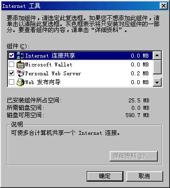 第二步,接下來(lái),進(jìn)入“控制面板”→“添加/刪除程序”→“Windows安裝程序”→“Internet工具”選項(xiàng),雙擊打開(kāi)它,選擇“Internet連接共享”,然后“確定”,系統(tǒng)將為你安裝和配置該程序。(如下圖)