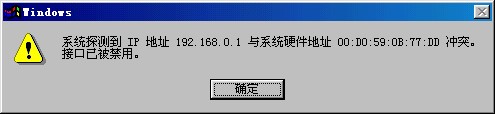 ●計(jì)算機(jī)使用中,或者剛進(jìn)入Windows的時(shí)候出現(xiàn)“系統(tǒng)檢測(cè)到IP地址與系統(tǒng)的硬件地址00:D0:59……沖突”這樣的一個(gè)警告窗口,這是怎么回事?(如下圖)