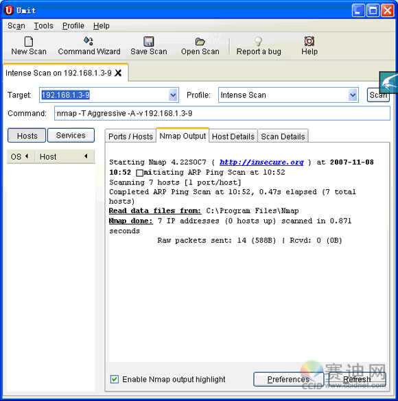 可以掃描單臺主機或一個范圍內(nèi)的主機,掃描時可以根據(jù)主機名,也可以根據(jù)IP地址。例如,需要掃描從192.168.1.3 到192.168.1.9范圍內(nèi)的所有主機,就應(yīng)該鍵入:192.168.1.3-9,如圖: