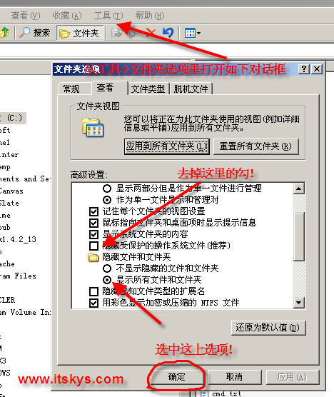 殺馬當(dāng)然要看進(jìn)程和顯示隱藏文件及擴(kuò)展名,不過(guò)病毒竟然在這里動(dòng)了手腳。在文件夾選項(xiàng)中“隱藏文件和文件夾“⒈不顯示隱藏的文件和文件夾 ⒉顯示所有文件和文件夾的地方選擇”顯示所有文件與文件夾“之后無(wú)法顯示,點(diǎn)擊應(yīng)用確定后依然如故,重新打開(kāi)發(fā)現(xiàn)自動(dòng)又變了回去。幸好以前在哪里看到過(guò)超級(jí)隱藏之類(lèi)的東西,本人還保存了那個(gè)顯示隱藏文件和文件夾的注冊(cè)表文件!