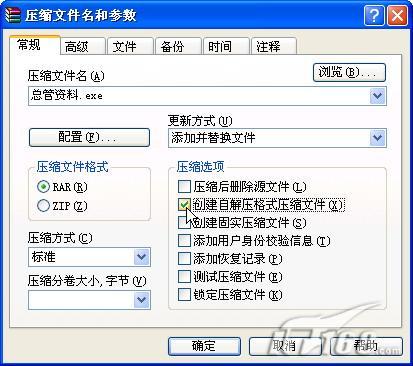 如,我們要把C:\總管資料.txt文件壓縮成EXE格式文件,則可以啟動(dòng)“資源管理器”,選中C:\總管資料.txt文件,右擊,選擇WinRAR→“添加到壓縮包”命令。然后在打開(kāi)“壓縮文件名和參數(shù)”設(shè)置窗口中選中“壓縮選項(xiàng)”下的“創(chuàng)建自解壓格式壓縮文件”前復(fù)選框(如圖1)。單擊“確定”按鈕即可把選定文件壓縮成自解壓的文件。