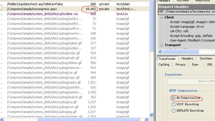 通過上圖可以看到,實際接收與查看屬性的體積都是一樣65452字節(jié),并且fiddler2檢測到頁面是no compression