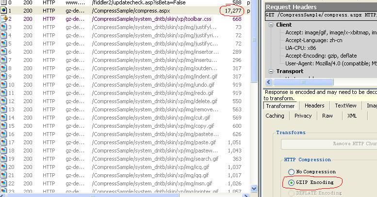 壓縮的效果終于看到了,fiddler2檢測到實際接收到的流量只有17277字節(jié),并且右下角顯示頁面采用的是GZIP Encoding,壓縮后的頁面體積只有原來的1/4!!!