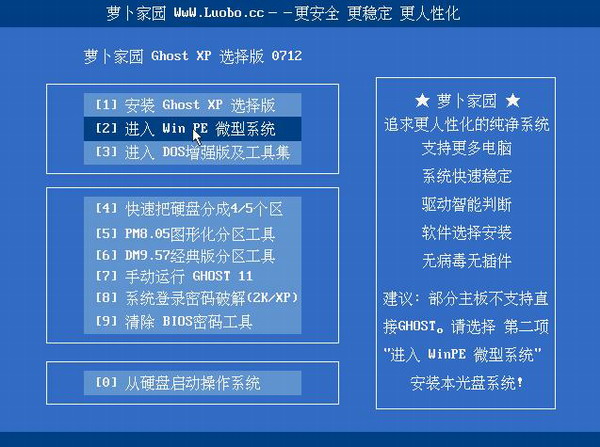 蘿卜家園的GhostXP光盤啟動(dòng)選項(xiàng)都有加入WinPE微型系統(tǒng),支持從WinPE安裝ghost系統(tǒng),intel965和p35主板用戶推薦用該選項(xiàng)安裝ghost系統(tǒng),特別是sata串口光驅(qū)用戶。