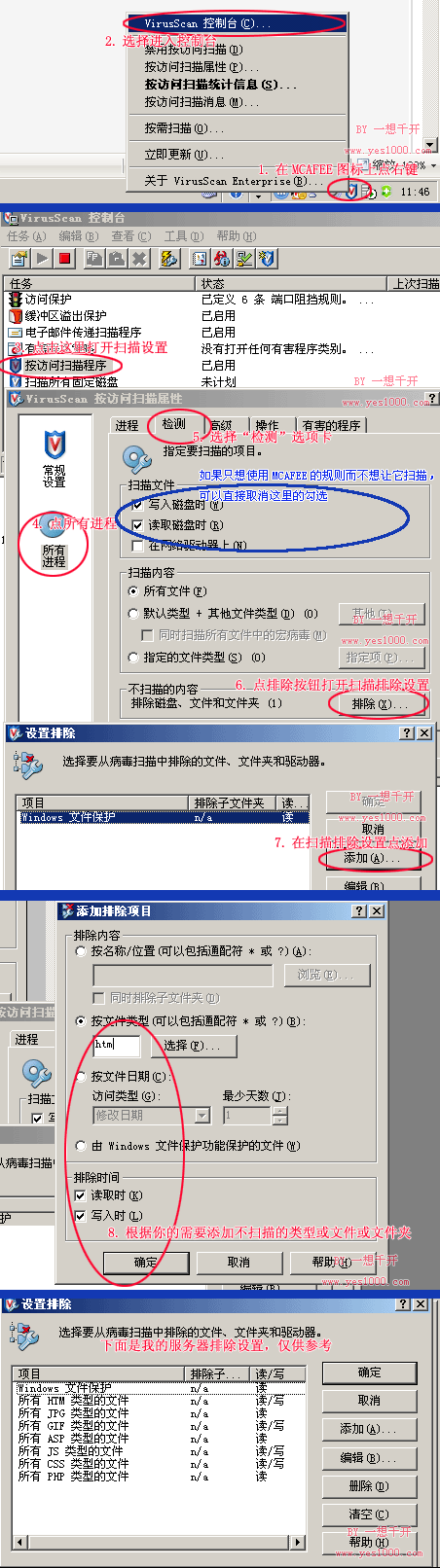 這個問題怎么解決呢?其實是個很簡單的問題。像網(wǎng)站里這些HTML文件還有圖片、JS等文件,沒有必要去掃描,這樣就可以不讓MCAFEE去掃描這些文件,也就可以不讓MCAFEE因為網(wǎng)站訪問量大而拖速度了。MCAFEE本身就有設(shè)置排除不掃描文件的功能的,不過隱藏的比較深大家可能都沒發(fā)現(xiàn)過。具體如圖(本文以MCAFEE8.0i版為例,其他版本可能略有不同):
