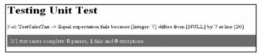 TestingTestCase定義了一個測試,TestSalesTax(),它包含了一個斷言函數(shù)AssertEqual()。如果它的前兩個輸入?yún)?shù)是相等的,它將返回true,否則返回false。(如果你想顯示assertEqual()失敗的信息,你可以傳入三個參數(shù)就像這樣$this->assertEqual(7,calculate_sales_tax(100), “The sales tax calculation failed”))。