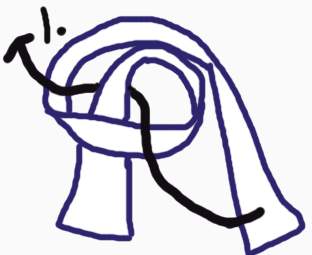 把重疊的圍巾放在左邊那段下面,把左邊的圍巾沿箭頭方向繞在另一段上