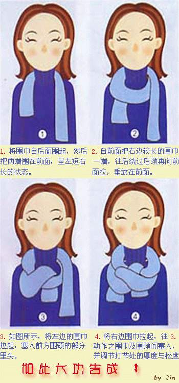 十、對折,然后在對折的地方打一個圈,再把另一端兩頭的塞進圈里.這樣的圍巾,最好不要折得整整齊齊,怎么樣不清楚怎么好.感覺懶懶散散的.