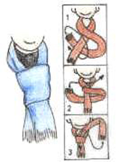把圍巾繞在脖子上,左右打個結(jié),左邊在上,右邊在下
